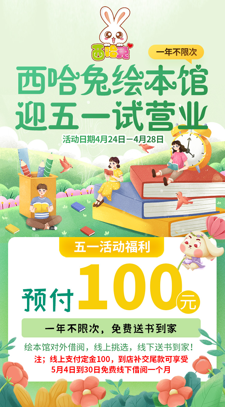 我正在参加【西哈兔绘本馆】迎五一试营业!预付100元组团秒杀原价699元超值礼包福利!更有惊喜好礼等你来拿!