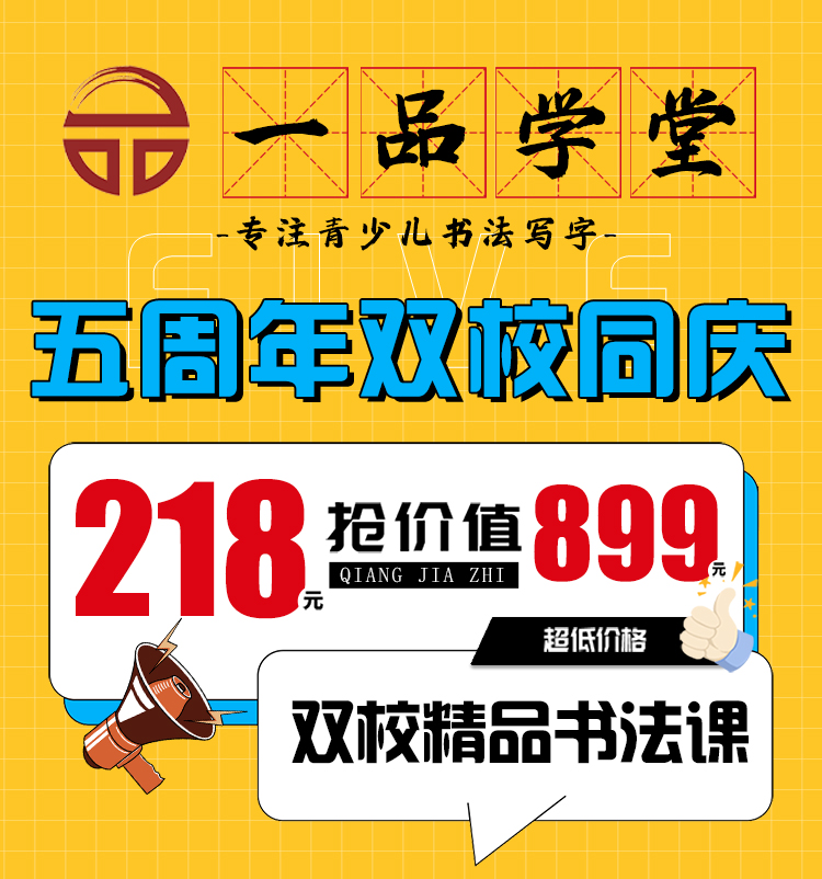 我正在参加【一品学堂 】五周年双校同庆活动!218元抢购价值899元精品书法课!更有诸多好礼等您拿~