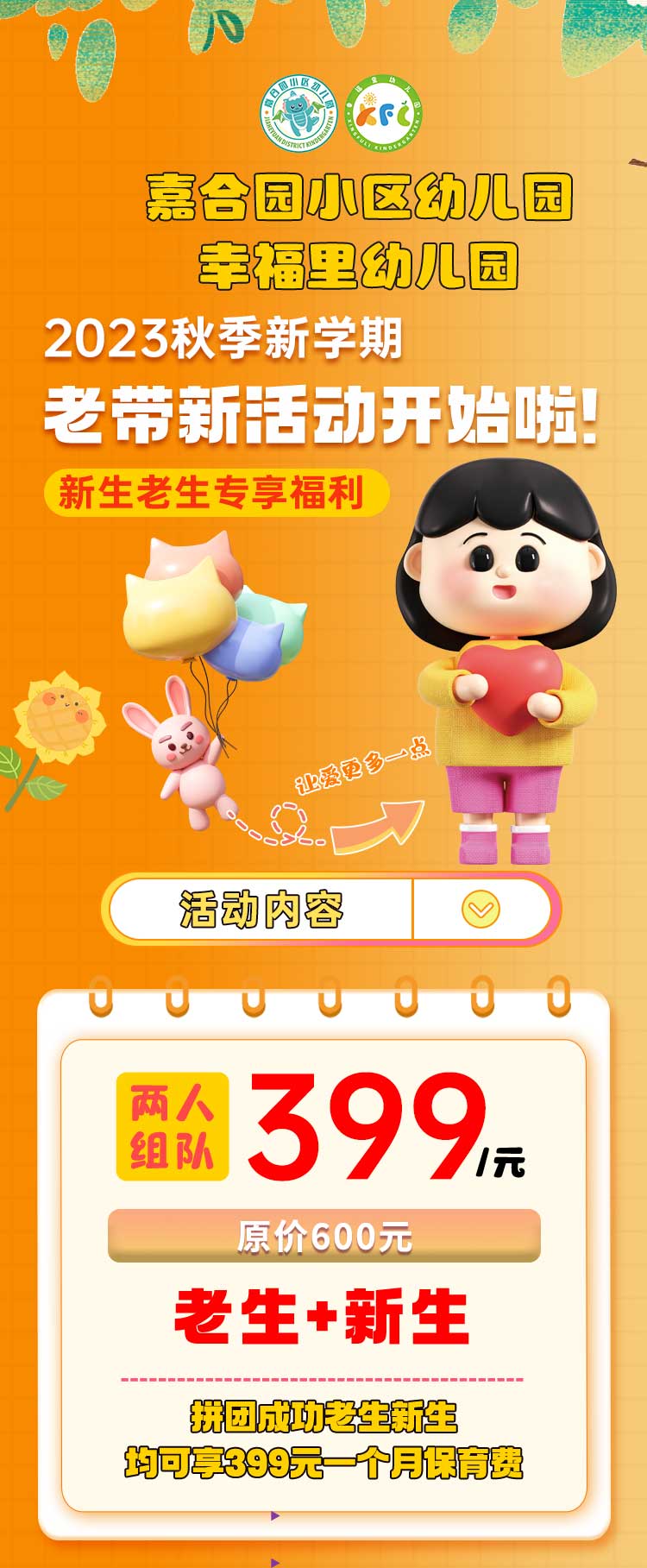 【嘉合园小区幼儿园&幸福里幼儿园】2023秋季新学期老带新活动开始啦!原价600元限时团购仅需399元!