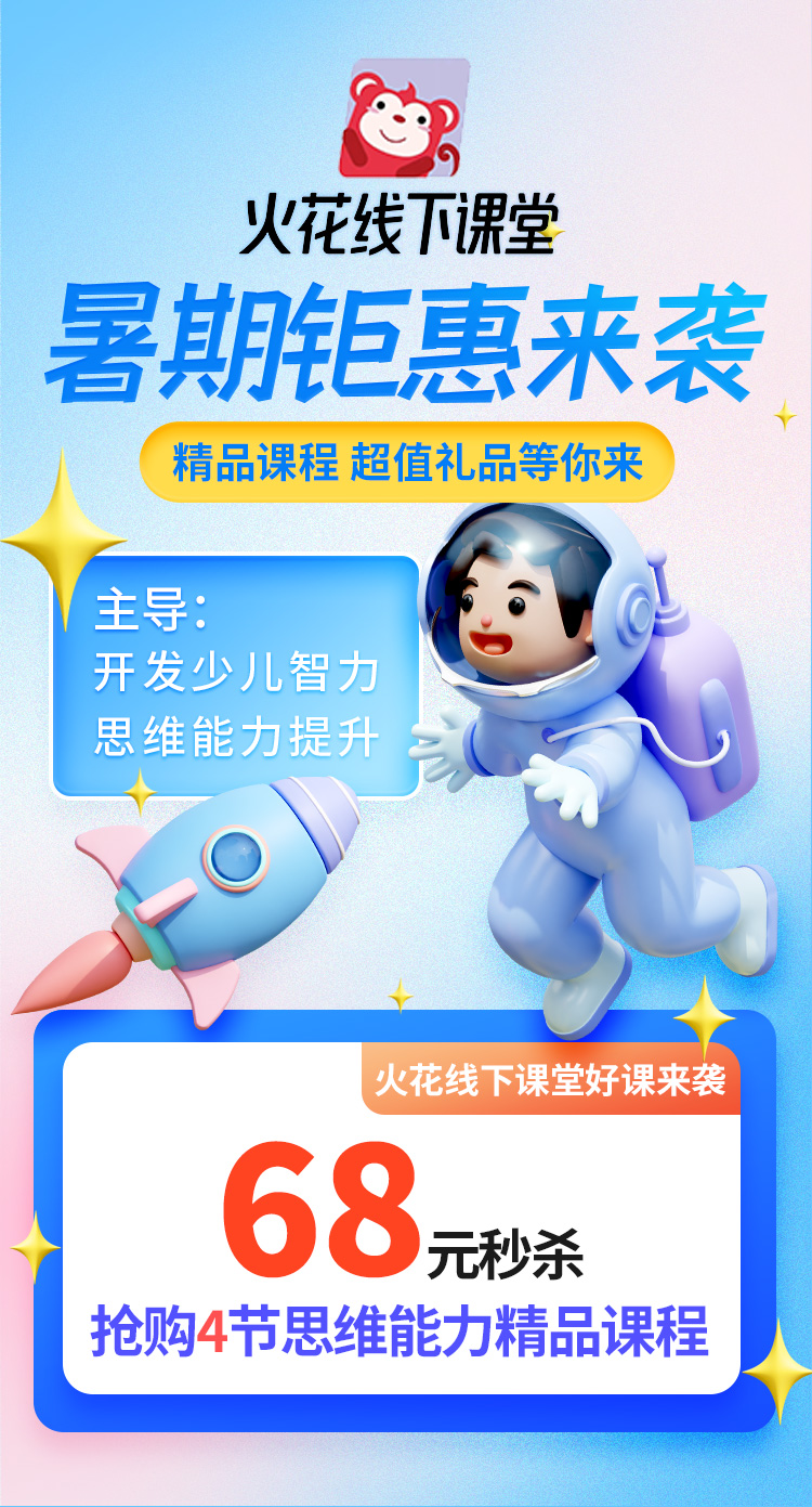 我正在参加【鹤壁火花思维 】暑期钜惠来袭!仅需68元秒杀抢购4节思维能力精品课程!还有超值福利等你!