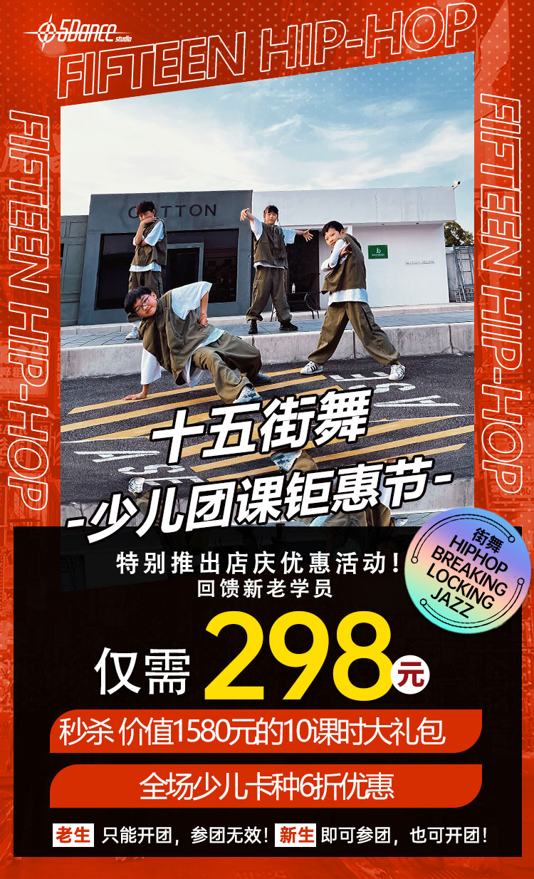 我正在参加【十五街舞 】少儿团课钜惠节!仅需298元秒杀!价值1580元的10课时大礼包!还有超值福利等你!