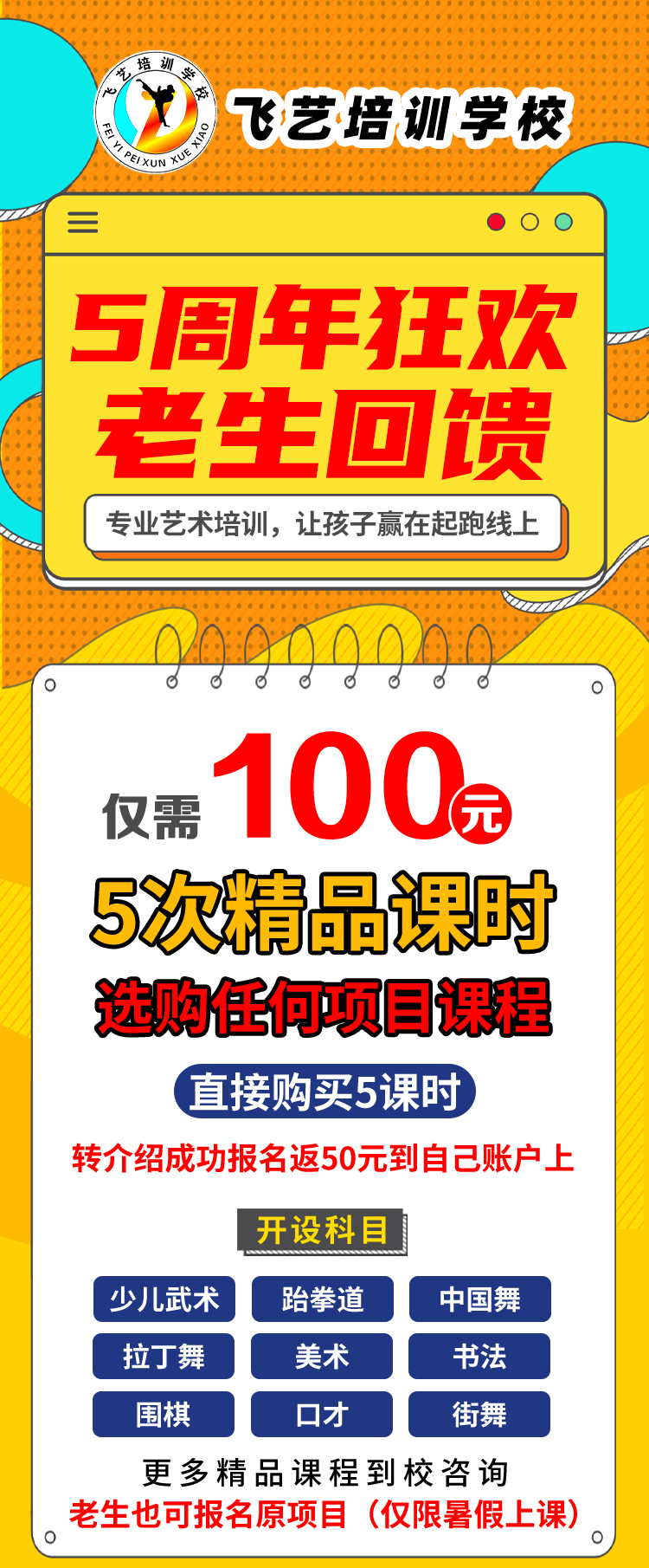 我正在参加【飞艺培训学校】5周年狂欢!老生回馈!专业艺术培训,让孩子赢在起跑线上!仅需100元秒杀名额5次精品课时!心动不如行动!快来和我一起拼团吧!