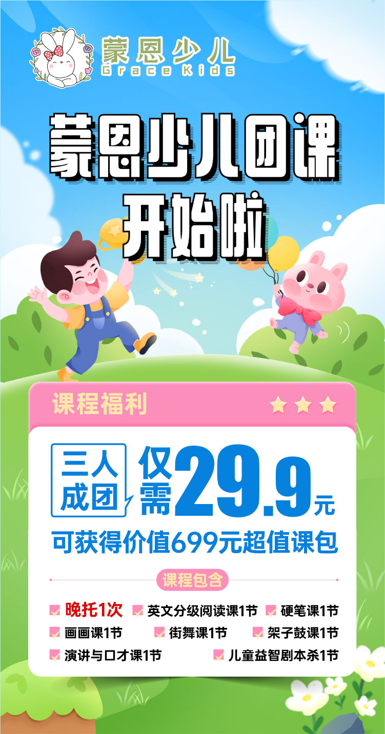 我正在参加【蒙恩少儿】少儿团课开始啦!3人拼团!仅需29.9元可获得价值699元超值课包!