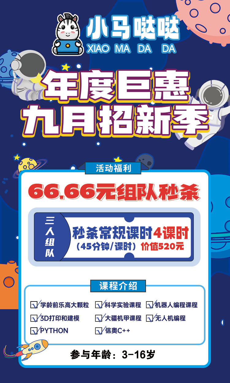 我正在参加【小马哒哒机器人】年度巨惠九月招新季!仅需66.66元组队秘杀秒杀价值520元常规课时4课时!