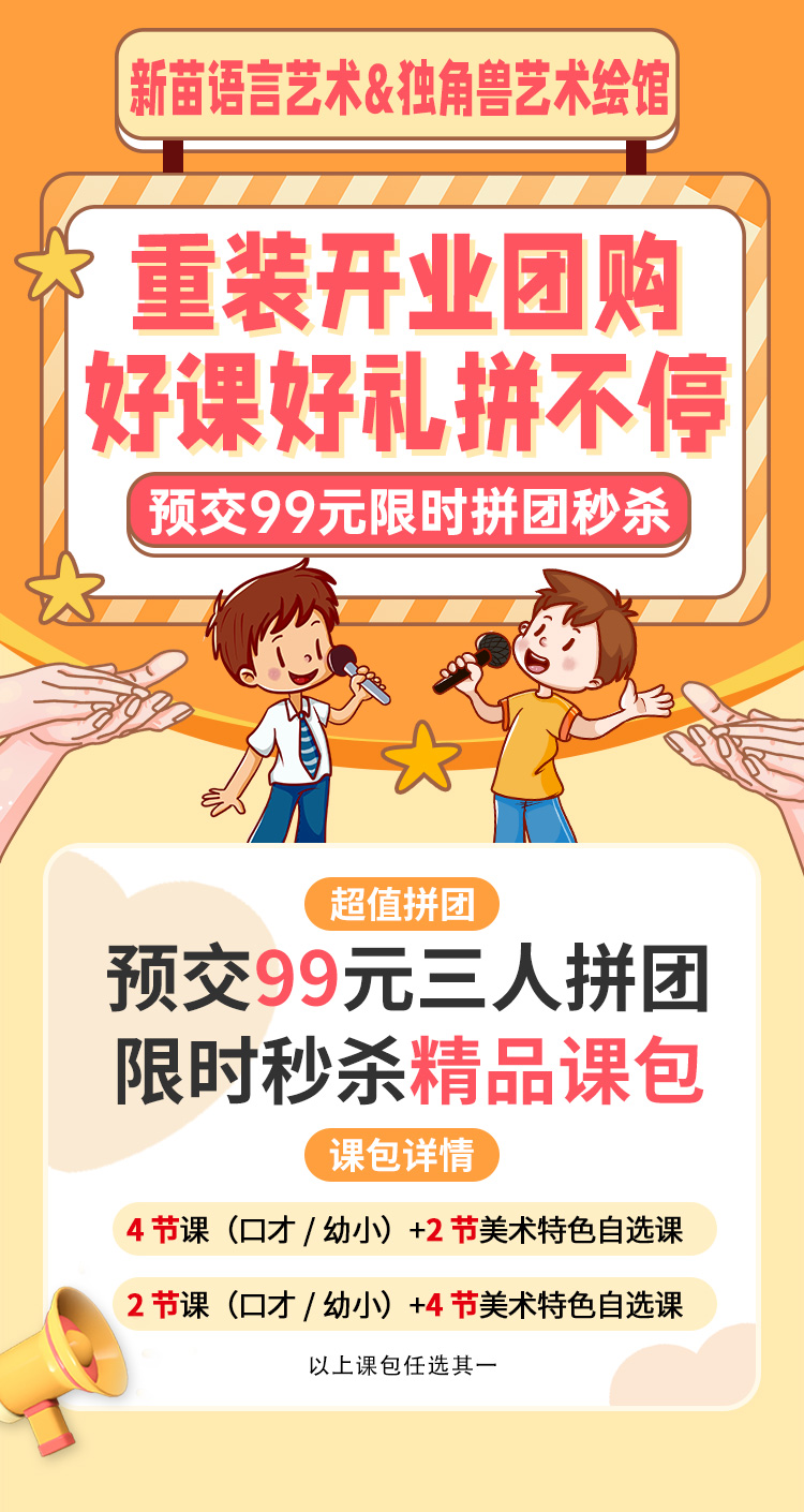 我正在参加【新苗语言艺术&独角兽艺术绘馆】重装开业团购!好课好礼拼不停!预交99元三人拼团 限时秒杀精品课包!