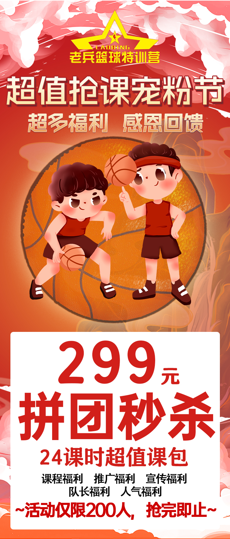 【转发链接有红包】老兵篮球超值抢课宠粉节!299元拼团秒杀24课时超值课包!