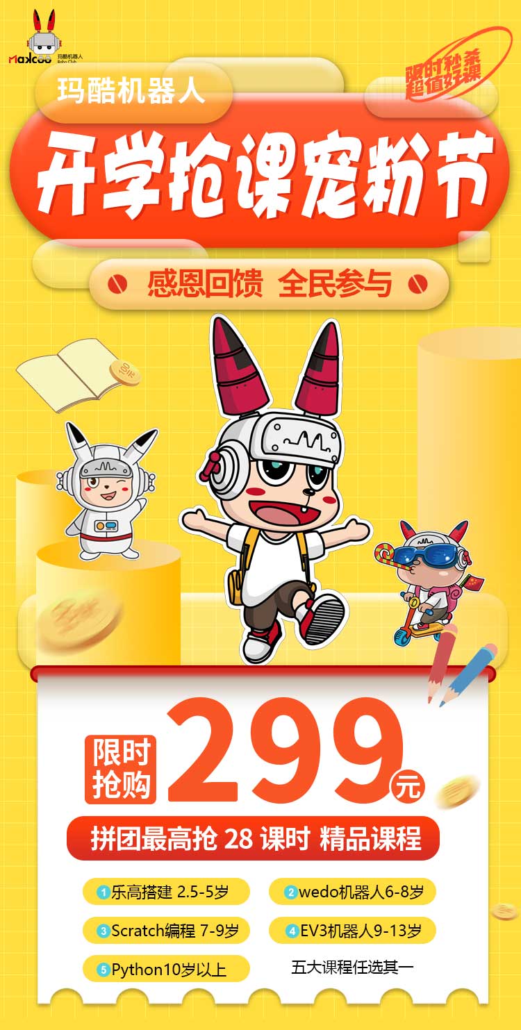 我正在参加【玛酷机器人】开学抢课宠粉节!299元抢购28课时超值课程!全年仅此一次!